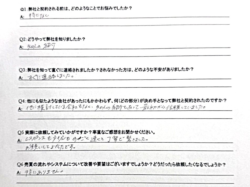 A: レスポンスも対応もすごく速くて丁寧で驚きました。