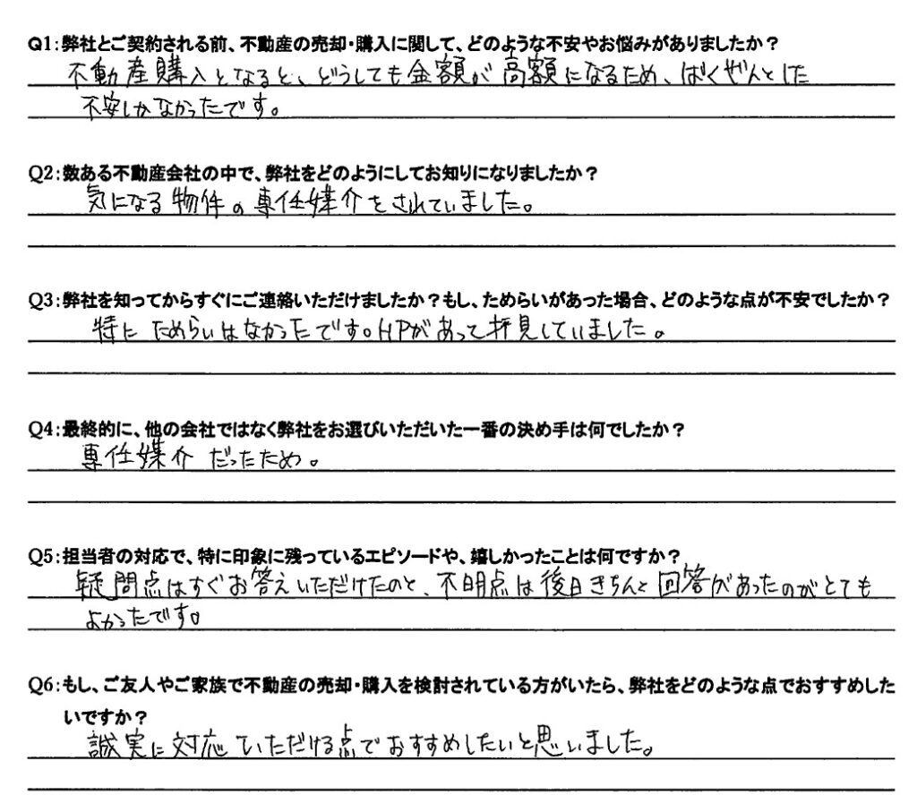 A:他の不動産より物件案内がていねいだと思います。おかげでよい取引ができました。